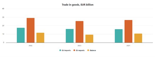 شكل (1): حجم التجارة والميزان التجاري بين الاتحاد الأوروبي وإسرائيل خلال الأعوام (2022 – 2024)[37]