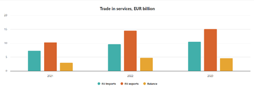 شكل (2): حجم التجارة في الخدمات والميزان التجاري بين الاتحاد الأوروبي وإسرائيل في الأعوام (2021 – 2023)[38]